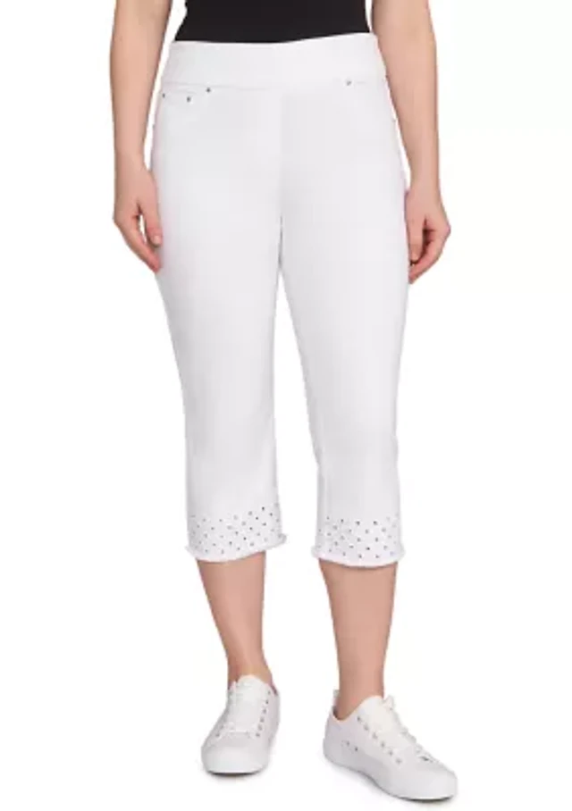 Petite Pull On Embroidered Hem Soft Stretch Denim Capri Pants