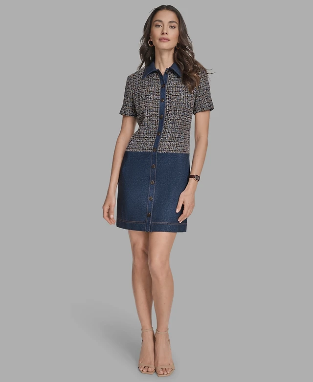 Bcbg Women's Short Sleeve Drop-Waist Tweed Denim Mini Dress