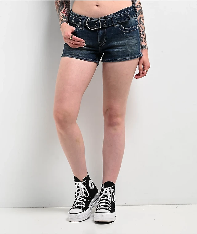 True Religion Joey Embroidered Low Rise Deep Wave Of Water Denim Shorts