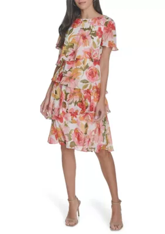 City Vibe Floral Printed Pleated Twist Front Tiered Ruffled Dress