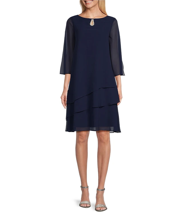 Calessa Petite Size Embroidered Tassel Tie V-Neck 3/4 Sleeve Tiered Midi Dress