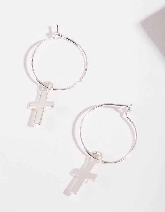 Mens Stainless Steel Cross Charm Polished Huggie Hoop Earrings