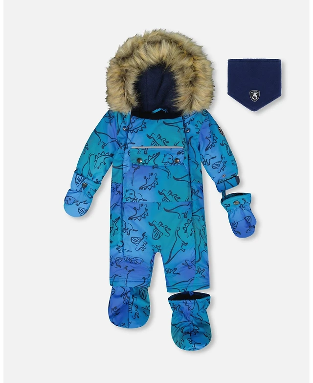 Deux par Deux Baby Boy One-Piece Baby Play Snowsuit Designed for Car Seat Blue Gradient Dinosaur Print - Baby|Toddler