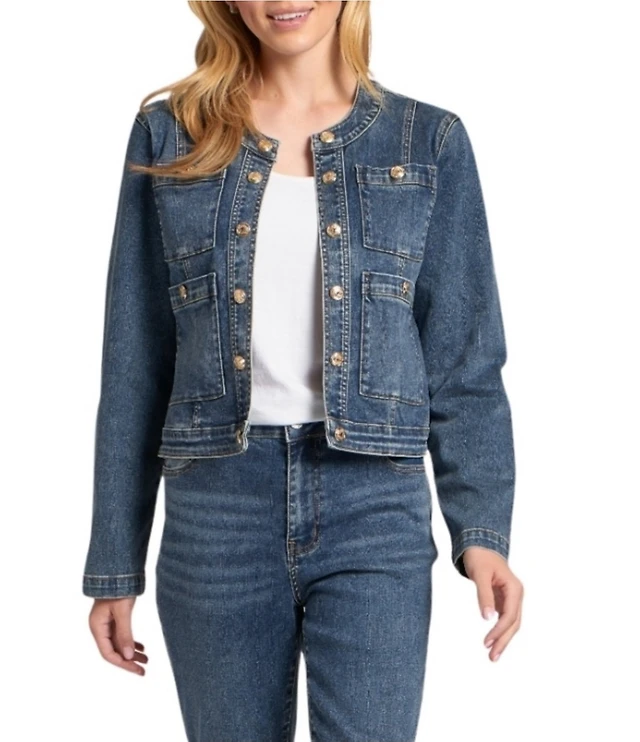 Azalea Wang Alara Pearl Embellished Collared Cropped Denim Jacket