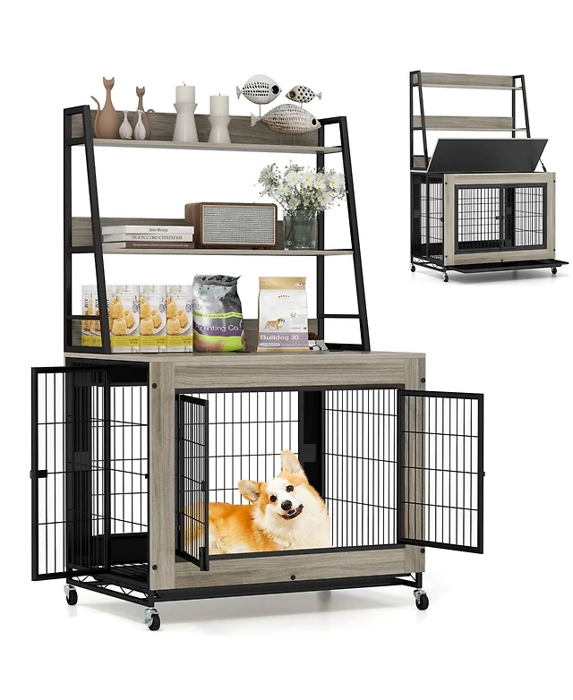 Gymax Dog Crate Furniture w/ Storage Shelves Industrial Dog Kennel w/ Flip-up Top