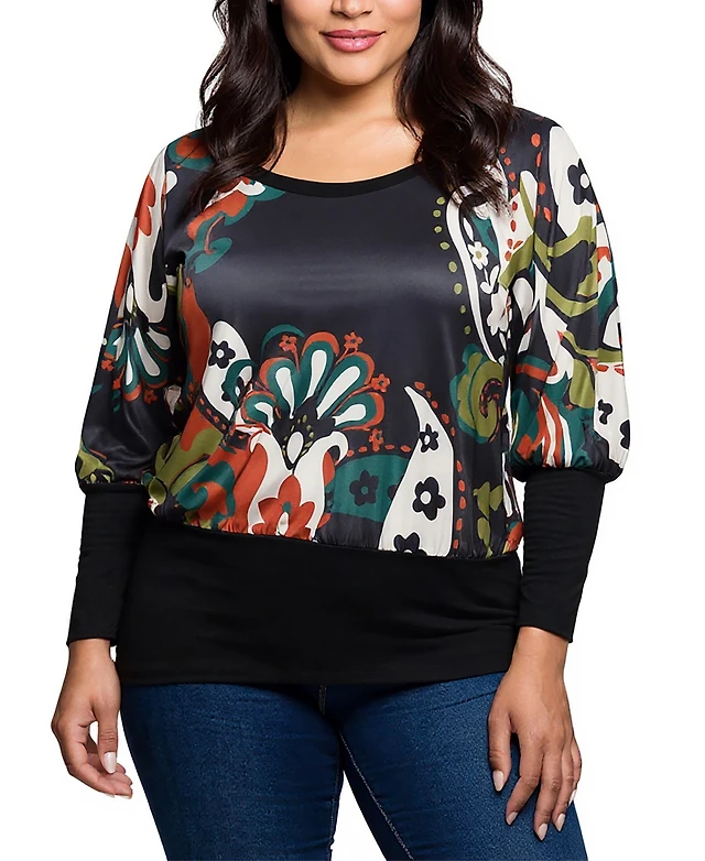 Leo & Nicole Plus Size Jacquard Print Crew Neck 3/4 Dolman Sleeve Top
