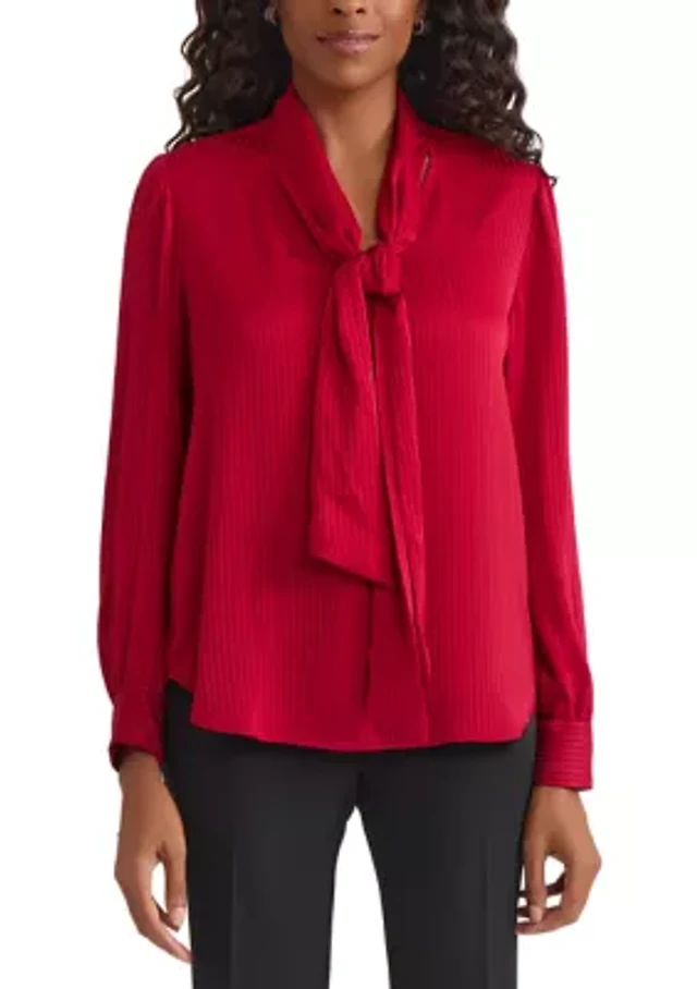 Women's Satin Stripe Long Sleeve Bow Blouse