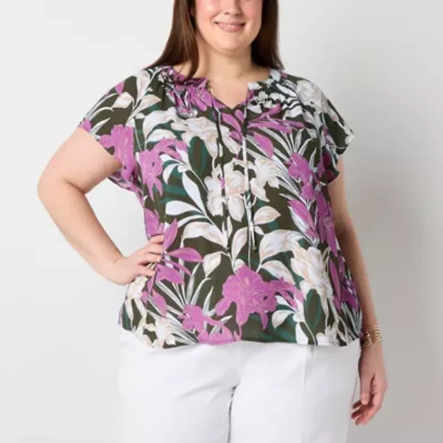 Liz Claiborne Womens Plus Split Tie Neck Short Sleeve Blouse