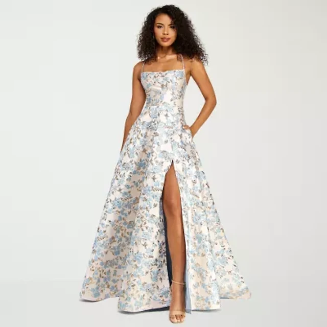 Emerald Sundae Juniors' Shimmer Organza Floral-Print A-Line Gown