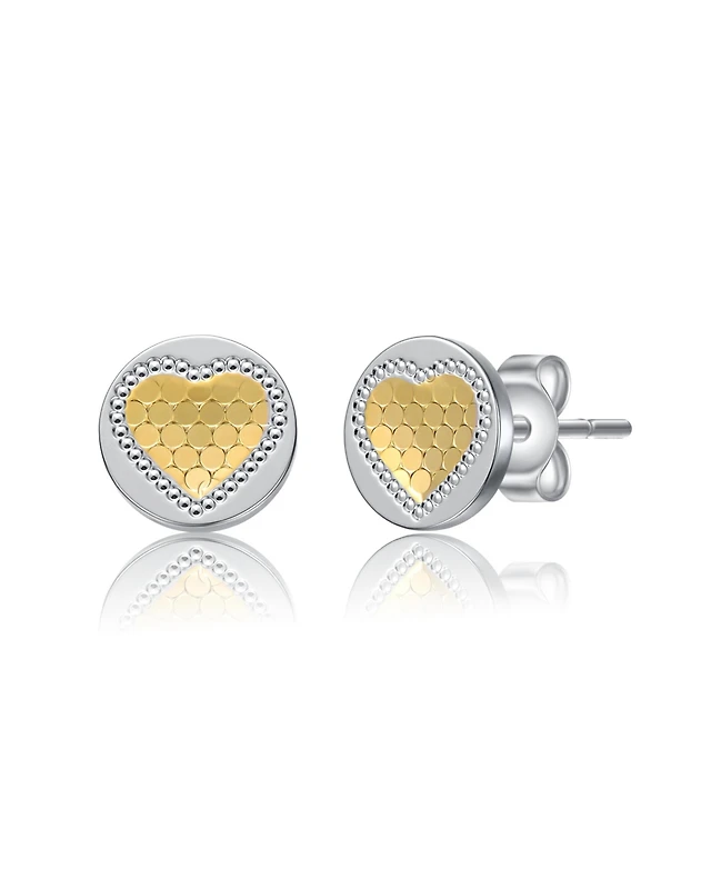Two-Tone Heart Milgrain Medallion Round Stud Earrings in White Gold Plated or 14K Gold Plated