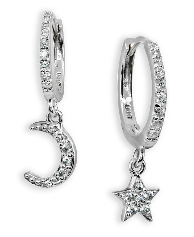 Cubic Zirconia Moon & Star Charm Drop Huggie Hoop Earring in Sterling Silver or 18k Gold Plated Sterling Silver