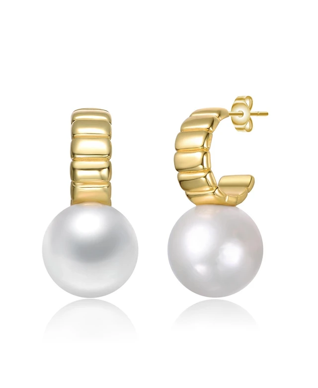 Sterling Silver 14k Yellow Gold Plated Oval White Freshwater Pearl Drop Medallion Dangle Earrings