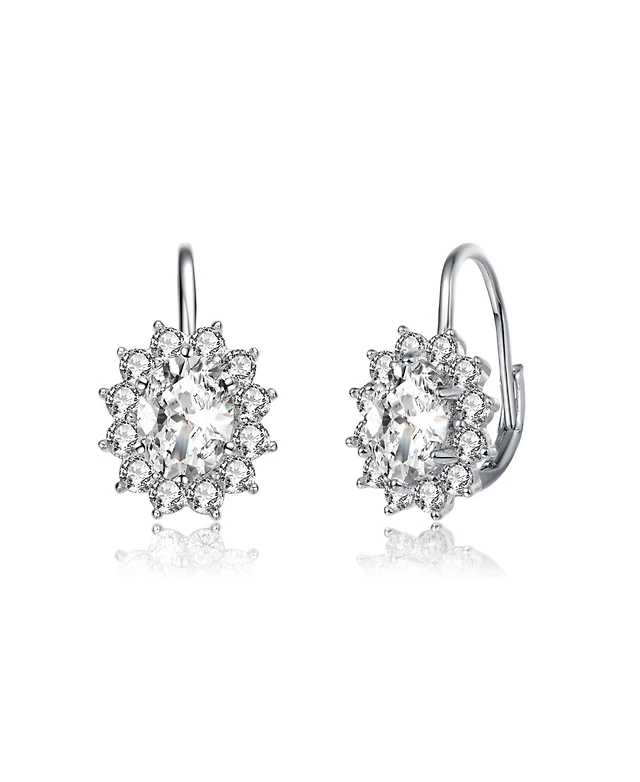 Sterling Silver with White Gold Plated Clear Round Cubic Zirconia Haloed Solitaire Drop Earrings
