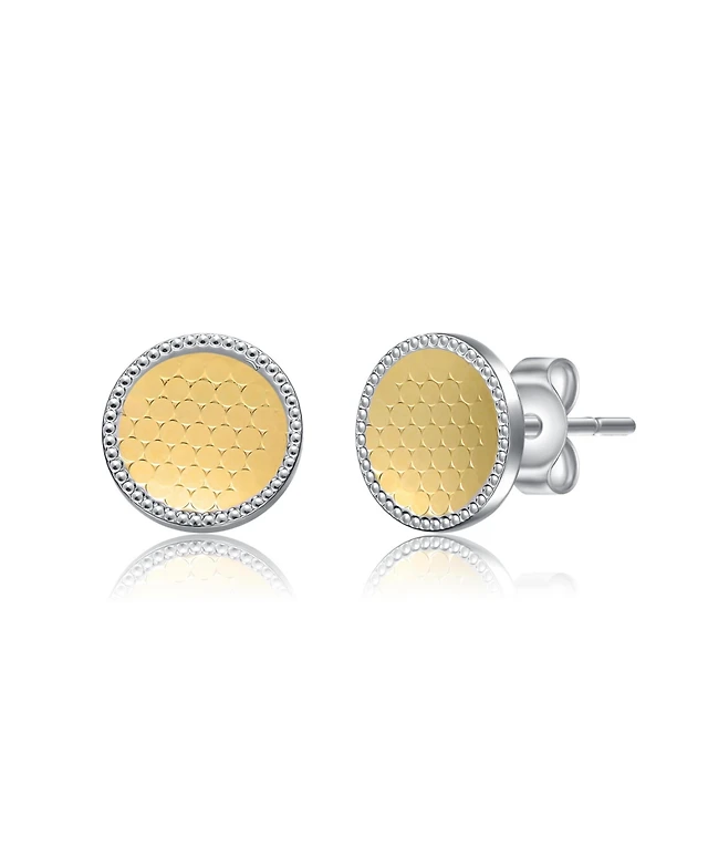 Two-Tone Milgrain Medallion Flower Stud Earrings in White Gold Plated or 14K Gold Plated