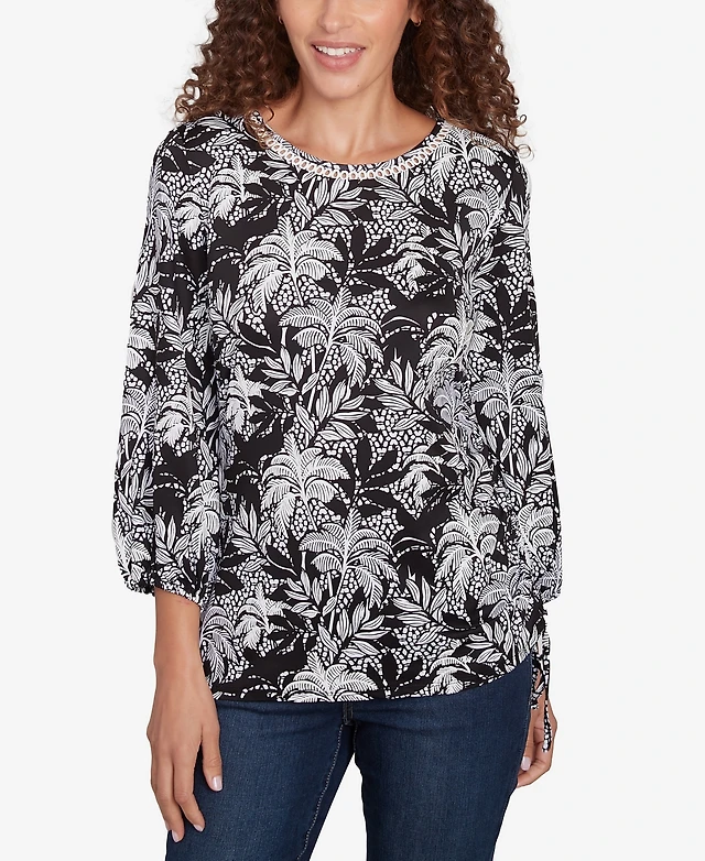 Alfred Dunner Petite Tropical Leaf Beaded Neck Ruched Top