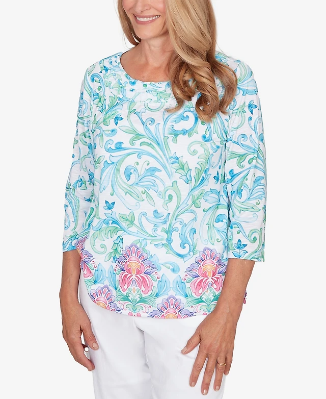 Alfred Dunner Petite Lake Champlain Asymmetrical Watercolor Flower Top