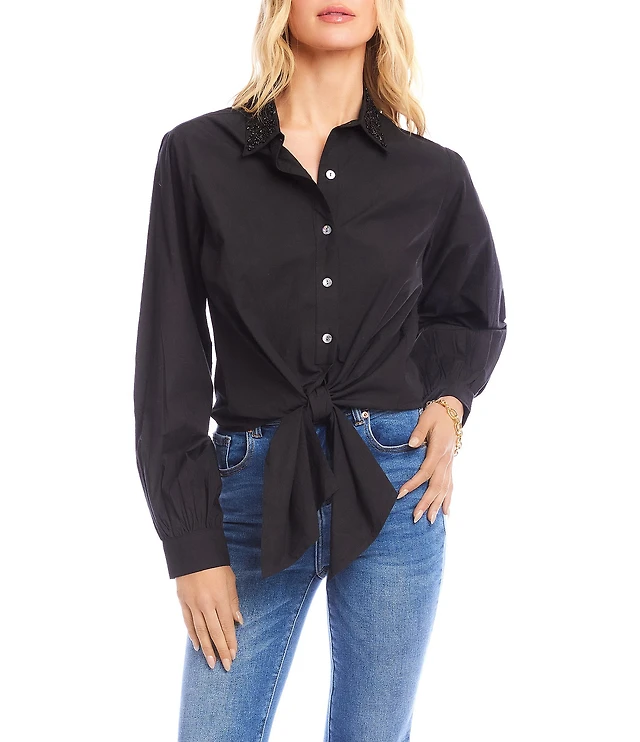 CeCe Poplin Point Collar Long Sleeve Pearl Button Down Top