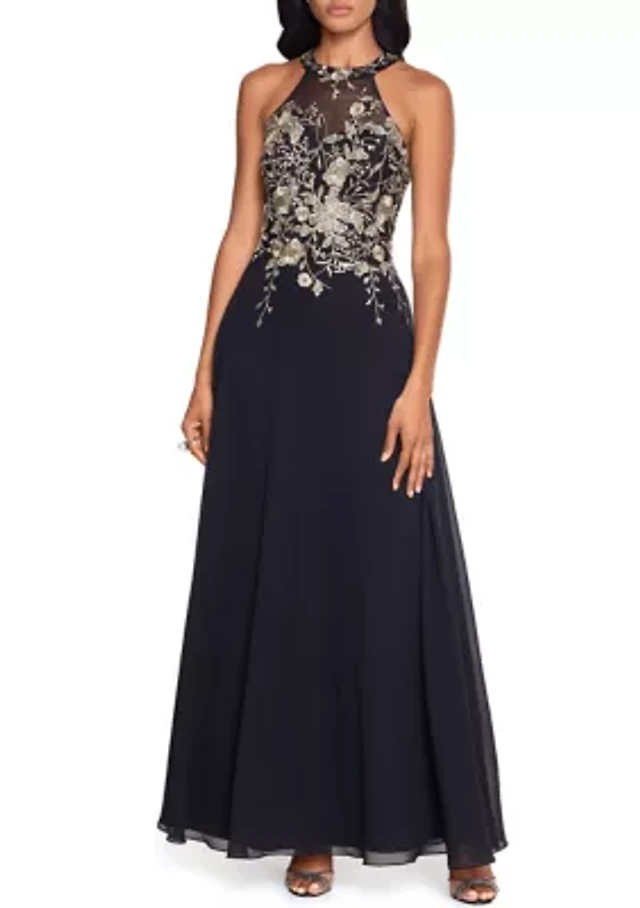 Juniors' Sequin Embroidered Lace Up Back Gown
