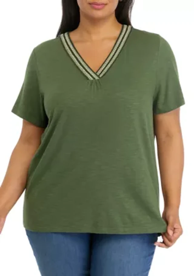 Plus Short Sleeve Embroidered V-Neck T-Shirt
