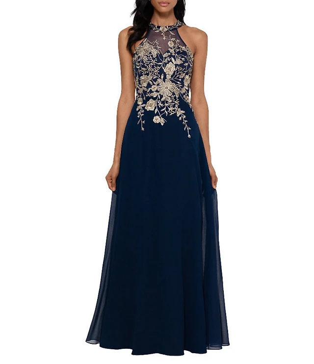 Mac Duggal Women's High Neck Mesh Tier Embroidered Dress