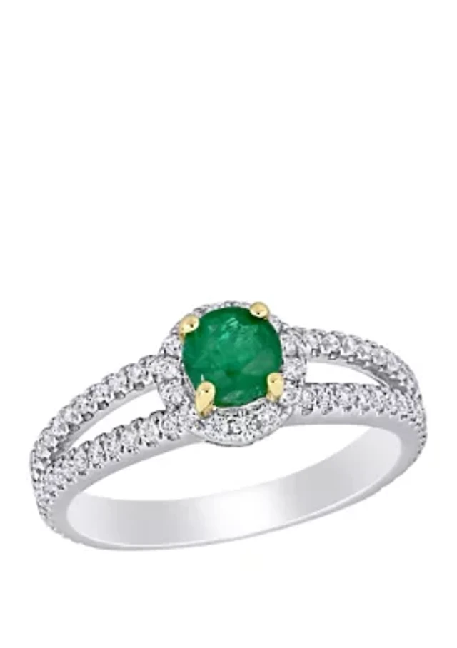 Emerald and Diamond Halo Split Shank Engagement Ring