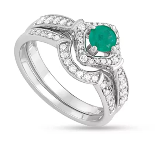 1.00 CTTW Emerald and White Diamond Bridal Ring Set 14K Gold