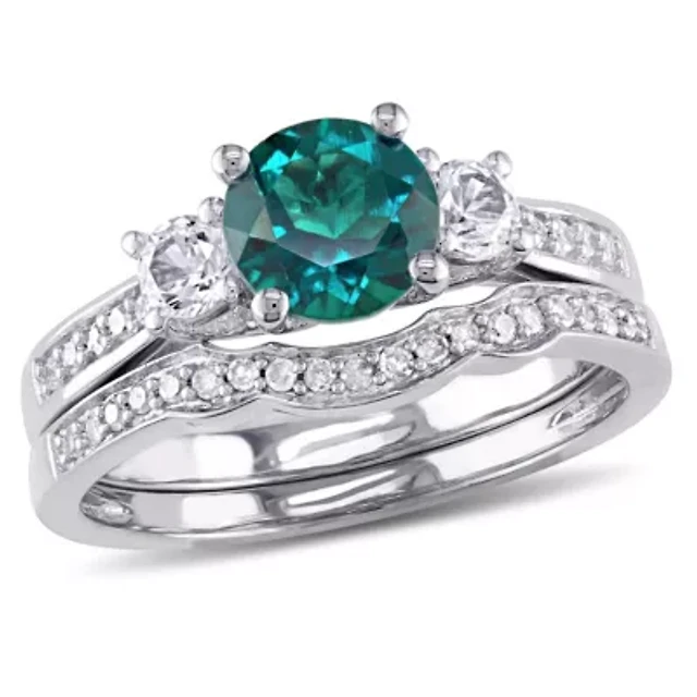 Lab Created Emerald and White Sapphire with 1/7 ct. t.w. Diamond 3-Stone Vintage Bridal Ring Set 10K Gold