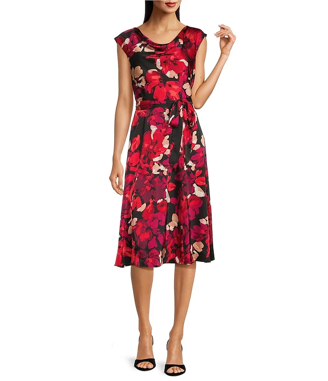 Kasper Printed Satin Cowl Neck Seamed Flare Dress
