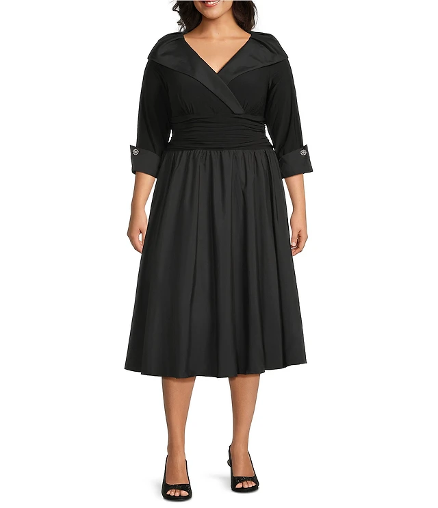 Jessica Howard Plus Size Jersey Taffeta 3/4 Sleeve Portrait Collar Ruched A-Line Midi Dress
