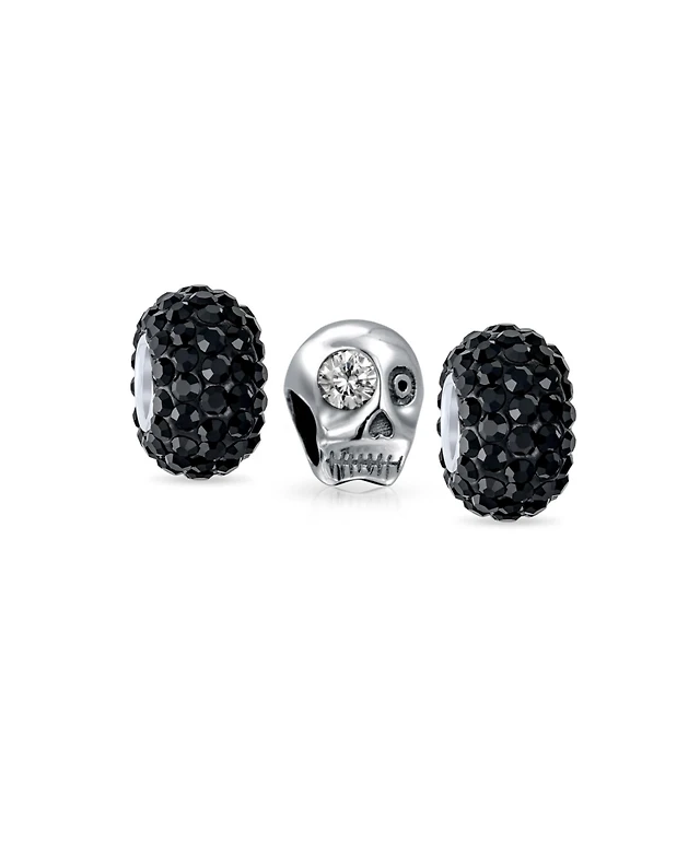 Bling Jewelry Set of 3 Halloween Skeleton Skull with Cz Eye & Solid Black Crystal Spacer Charm Bead Sterling Silver