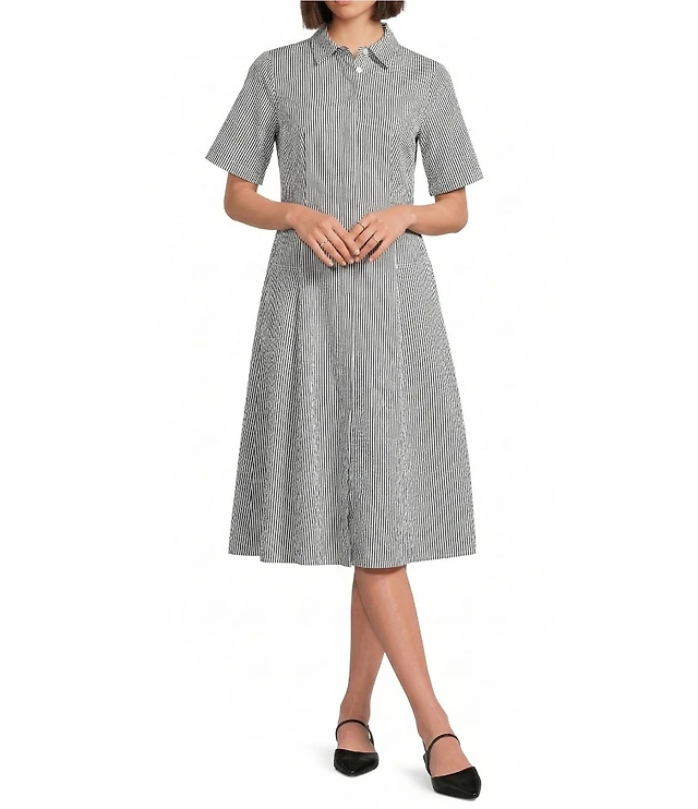 Hope & Henry Women's Short Sleeve Button Front Chambray Dress with Waist Sash