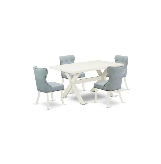 East West Furniture V076CE215-5 5-Piece Dining Set- 4 Dining Room Chairs with Baby Blue Linen Fabric Seat and Button Tufted Chair Back