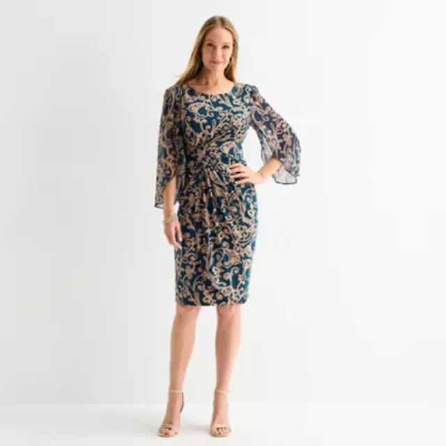 Adrianna Papell Stretch Boat Neck 3/4 Bell Sleeve Ruched Waist Sheath Dress