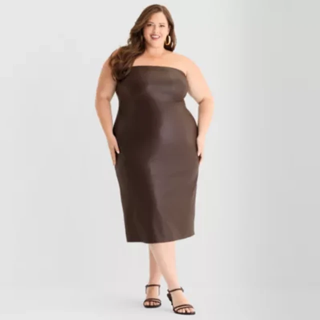 Ashley Graham Womens Plus Sleeveless Midi Faux Leather Sheath Dress