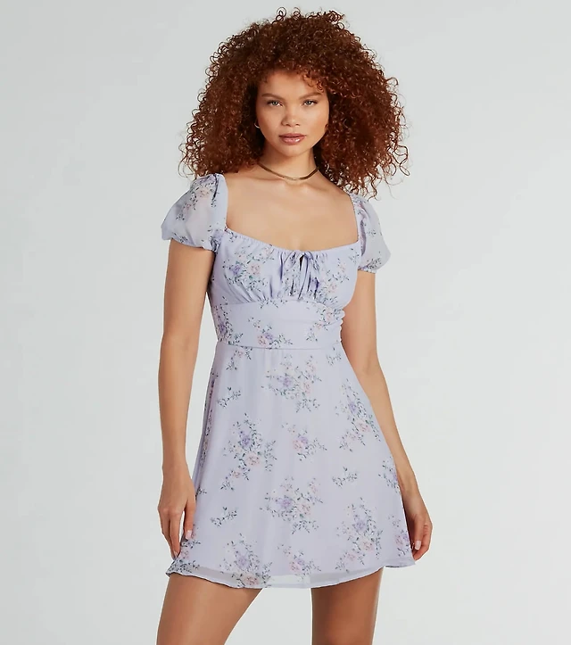 Sweetest Style Puff Sleeve Floral Chiffon Skater Dress