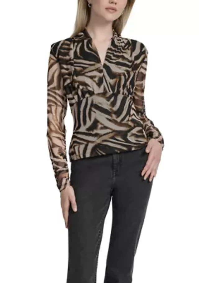 Women's Long Sleeve Ruffle Printed Sheer Blouse