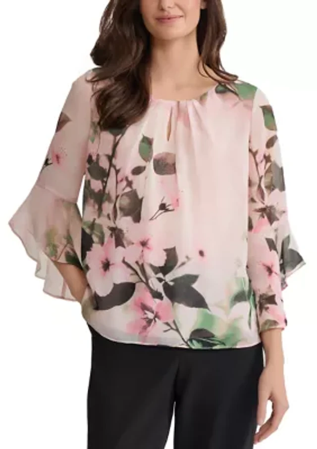 Petite Floral Print Flutter Sleeve Blouse with Keyhole