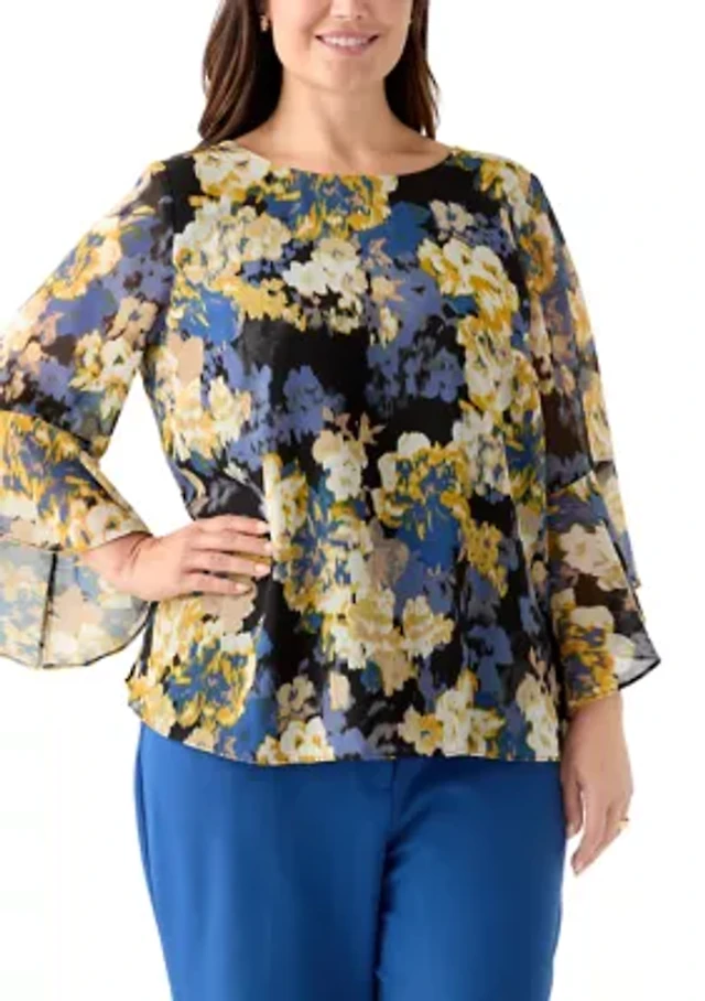 Premier Amour Off The Shoulder Floral Womens Straight Neck Long Sleeve Blouse