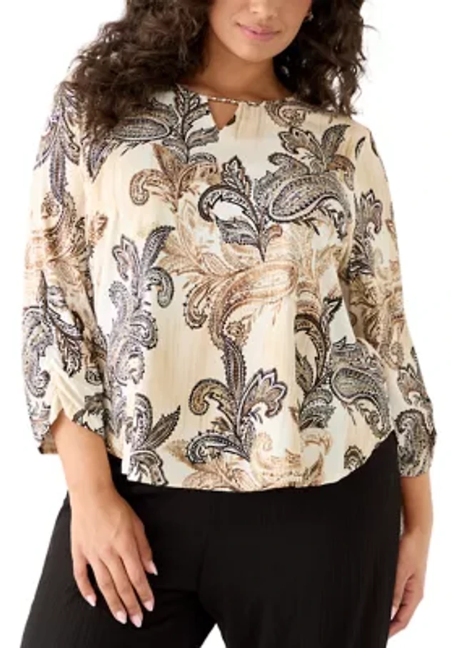 Plus 3/4 Sleeve Printed Chiffon Burnout Blouse