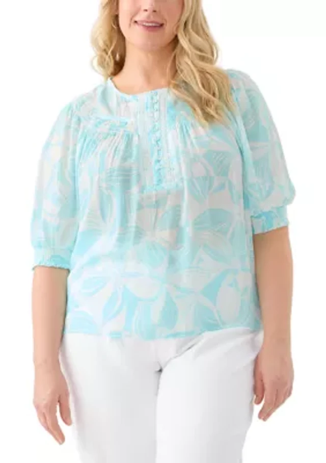 Plus 3/4 Blouson Sleeve Printed Popover Blouse