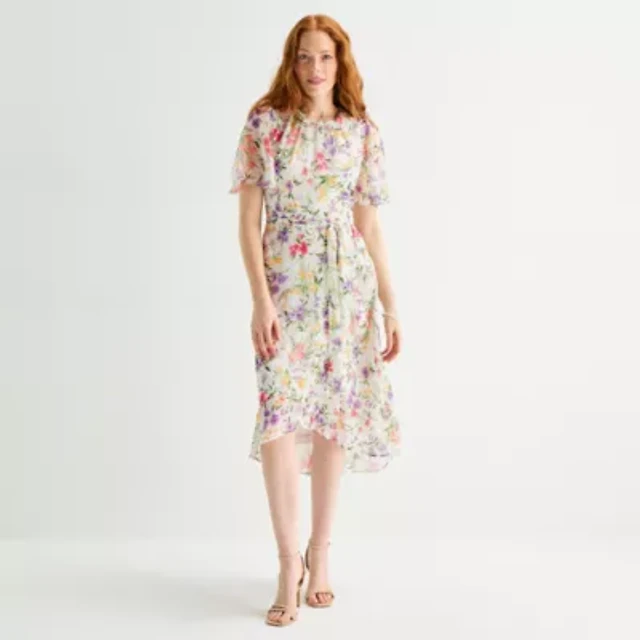 Liz Claiborne Womens Short Sleeve Midi Floral Satin A-Line Dress