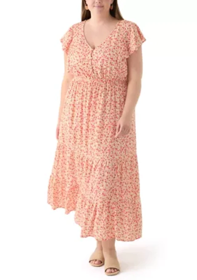 Robbie Bee Plus Flutter-Sleeve Handkerchief-Hem Midi Dress