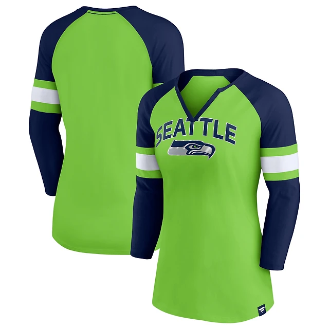 Women's Fanatics Neon Green/College Navy Seattle Seahawks Arch Raglan 3/4-Sleeve Notch Neck T-Shirt
