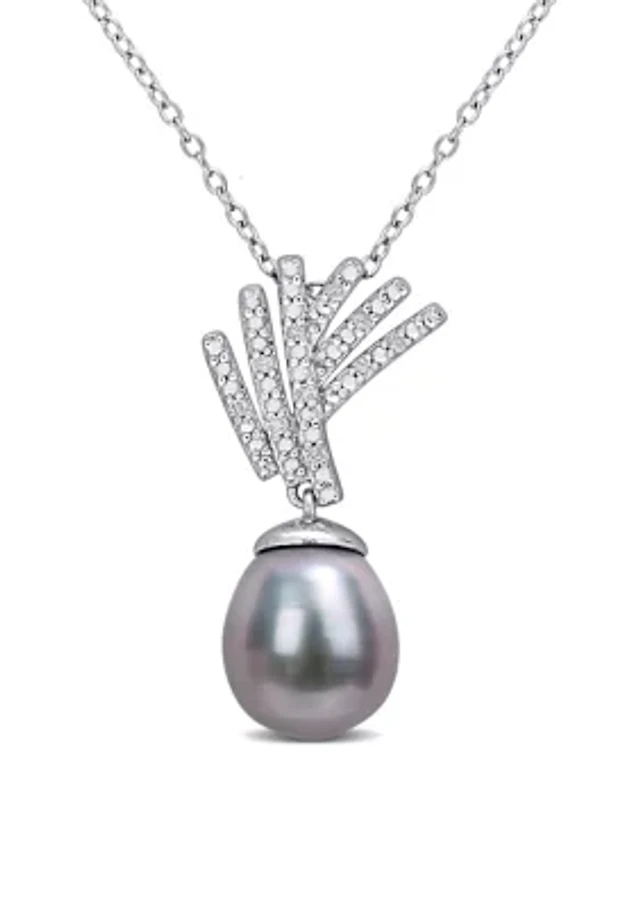 9.5-10mm Black Tahitian Cultured Pearl and Diamond Accent Drop Pendant with Chain in Sterling Silver