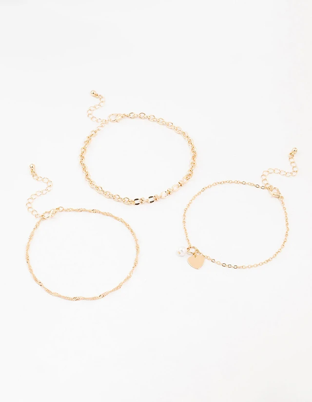 Gold Pearl Heart Drop Anklets 3-Pack