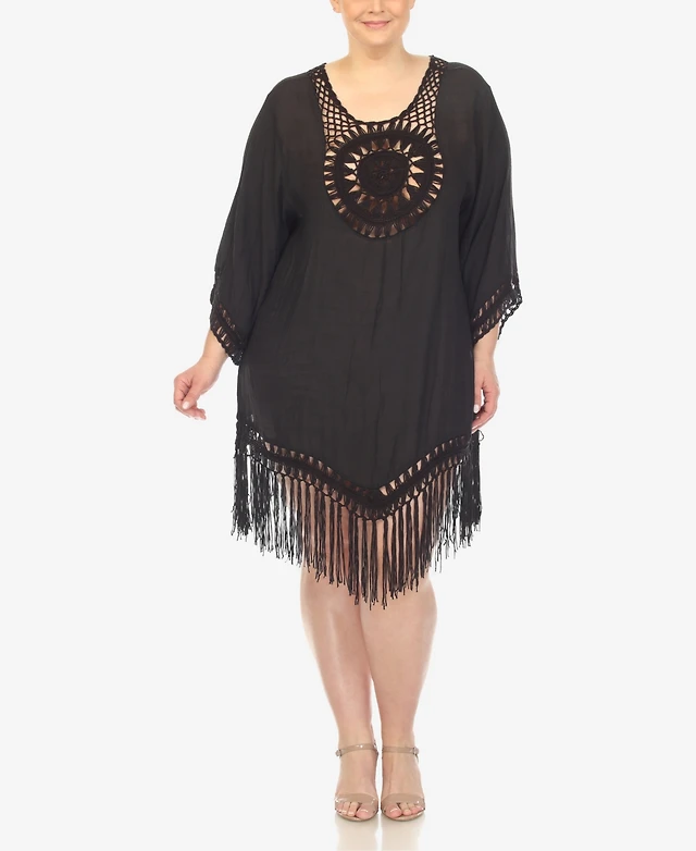 White Mark Women's Crocheted Fringed Trim 3/4 Sleeves Cover Up Dress