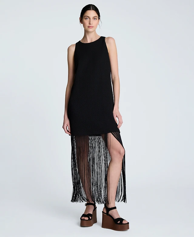 Ming Wang Lurex Fringe Trim Jacquard Knit Scoop Neck Sleeveless Midi Sheath Dress