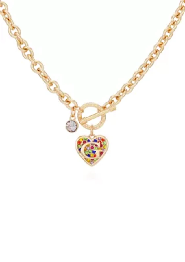 Guess Gold-Tone Rainbow Pave Logo Heart 17" Pendant Necklace