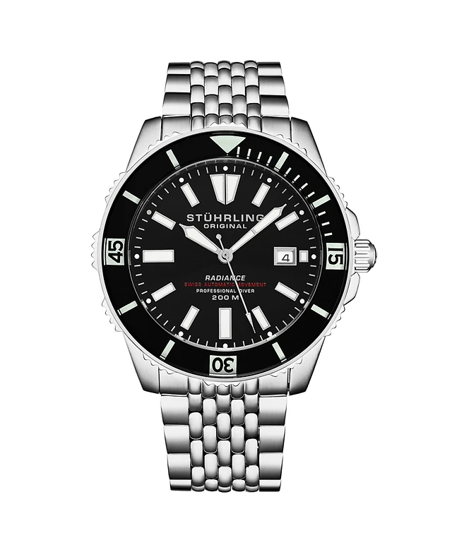Stuhrling Men s Aquadiver 44mm Swiss Automatic Diver Watch, Black Dial, Rotating Bezel, Stainless Steel, 200M Water Resistant