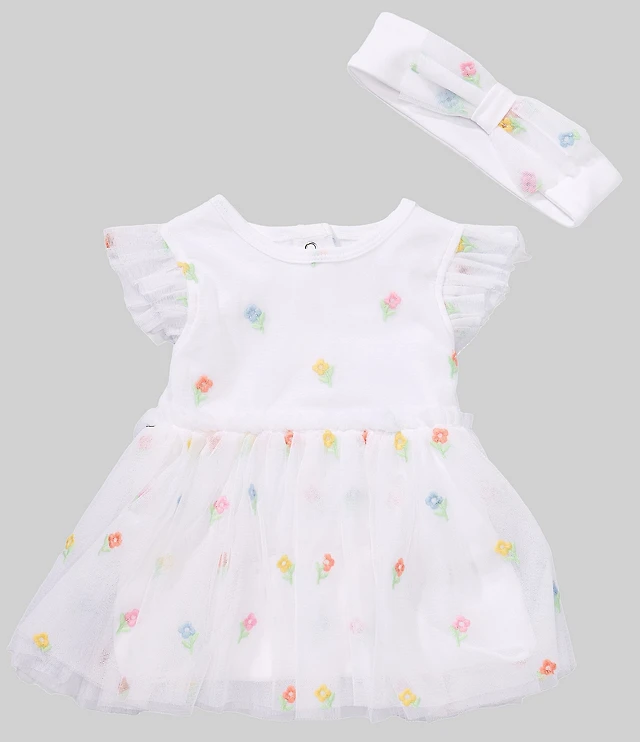 Baby Mode Girls 2 Piece Aqua Floral Romper with Tulle Over Skirt and Matching Headband